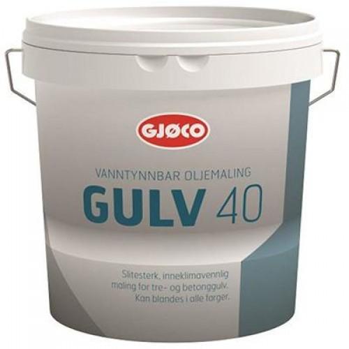 Gjøco Gulv 40 er vanntynnbar gulvmaling basert på polyuretanmodifisert alkyd. Malingen har gode påføringsegenskaper, god utflyt og er meget slitesterk. Benyttes på innendørs tregulv og gammel betong. Må ikke benyttes på ny betong eller på fuktige flater.